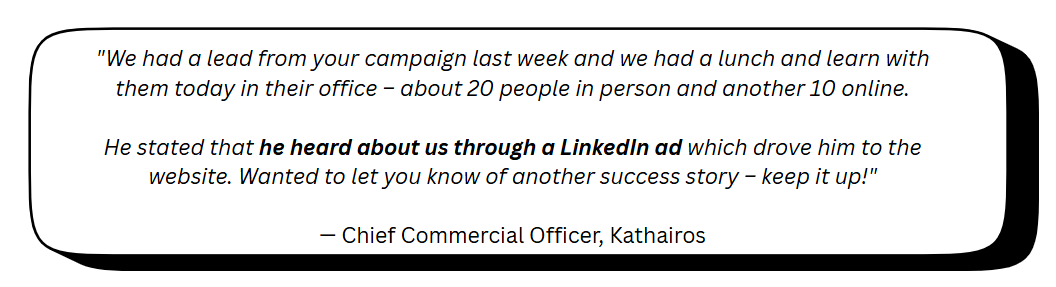Once audiences engaged, they entered retargeting groups that explored deeper themes of reliability, simplicity, and operational ease; the qualities that define Kathairos’ technology. These retargeting groups merged diverse traffic from organic search, LinkedIn page engagers, and paid search; then used LinkedIn's powerful B2B targeting filters to refine them into a single powerful, on-target audience.