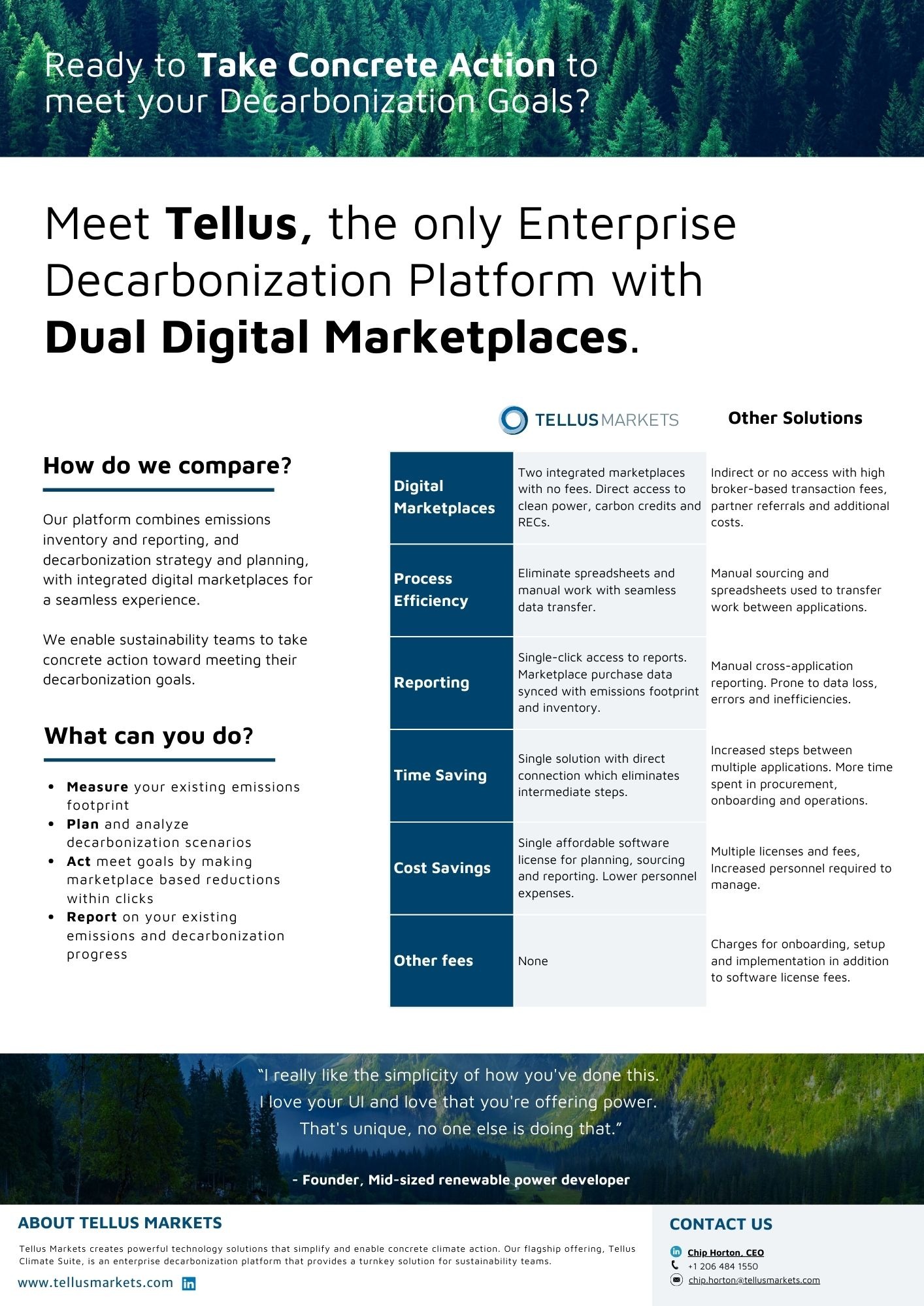 Tellus connects corporate emissions data and climate strategy directly with digital marketplaces for clean power, carbon credits, and RECs.