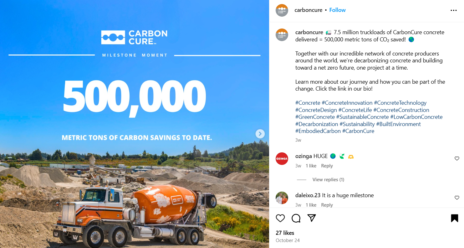Like how CarbonCure is killing it with their strong Instagram game and is garnering all the attention. Their post celebrated a major milestone: delivering over 7.5 million truckloads of their sustainable concrete, which has saved 500,000 metric tons of CO₂ emissions. And just like this, you too can leverage Instagram to share impactful progress of your cleantech solutions while weaving a strong brand presence!